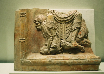 배꼽 위는 완전히 잘리고 무릎에 닿은 오른손만 보이고 악귀도 한 마리만 보인다. 국립중앙박물관에 있는 것과 거의 같기에 경주의 것과 비교를 해 본다. 서울 것은 젖가슴 위만 잘리고 밑은 거의 온전하다. 힘으로 제압한 것이 아니라 마음으로 감화를 주었는지 악귀 두 마리가 항복할 테니 그냥 저희 등에 앉으세요,라고 말하는 듯한 모습이다. 그러다 보니 사천왕은 왼손에 칼을 들고 오른쪽 손바닥은 쫙 펴서 여차하면 악귀를 치겠다는 모습 같다. 어쩜 저리 여유로울까. 악귀는 밟히고 있어도 행복한 복종을 하고 있는 모습이다. 마음에서 우러나는 복종이라서 당신에게 밟히고 있어도 나는 행복하다고 말하는 듯 하다.