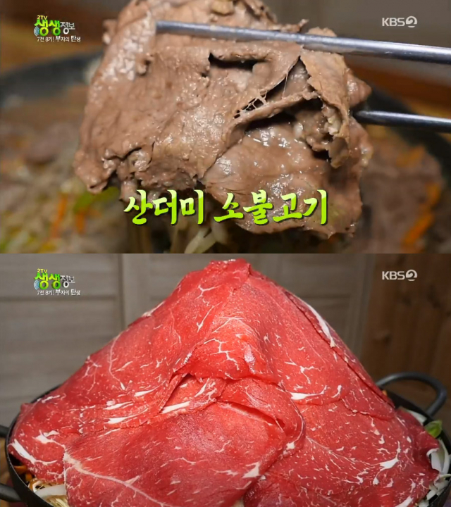 광주 광산구 평동로800번길(옥동)에 위치한 '바를정'이 이날 '산더미 소불고기' 대박 맛집으로 알려진 곳이다. 압도적인 비주얼로 손님들의 시선을 끌어내는 '산더미 소불고기'는 익어가며 사르르 녹는 모습이 인상적이다. 수북히 쌓아 올린 숙주 위에 2mm 두께의 소고기를 쌓아 비닐하우스 처럼 채소의 열기가 빠져나가는 막아 더욱 부드럽게 익으며 채수가 우러나고, 고기 역시 서서히 익어 연한 상태로 즐길 수 있다고 한다.