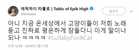 그는 지난 17일에도 "아니 지금 온세상에서 고양이들이 저희 노래 듣고 진짜로 평온하게 잠들다니 이게 말이나 되나 ㅋㅋㅋㅋ #LullabyForACat"라는 글을 올리며 신기해했다.