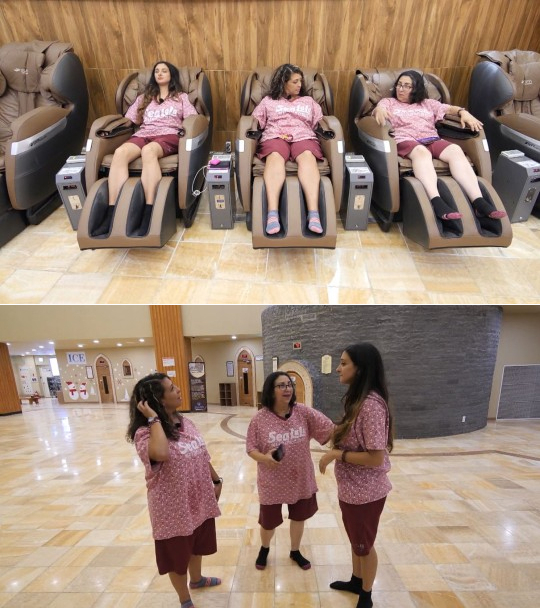 찜질방에 들어선 삼인방은 찌뿌둥한 몸을 풀기 위해 안마의자에 앉았다. 하지만, 안마가 시작되자 알레이다는 “이거 척추 다 부서지겠는데?”라며 3분 만에 의자에서 탈출했고 다시 쉴 곳을 찾아 나섰다. 알레이다의 방황은 고향과 온도가 비슷한 적외선방을 찾고 나서야 끝이 났다. 46도의 적외선방에 들어선 알레이다는 “여기가 도미니카공화국이네”라며 기뻐했고 누워서 몸을 지졌다.
