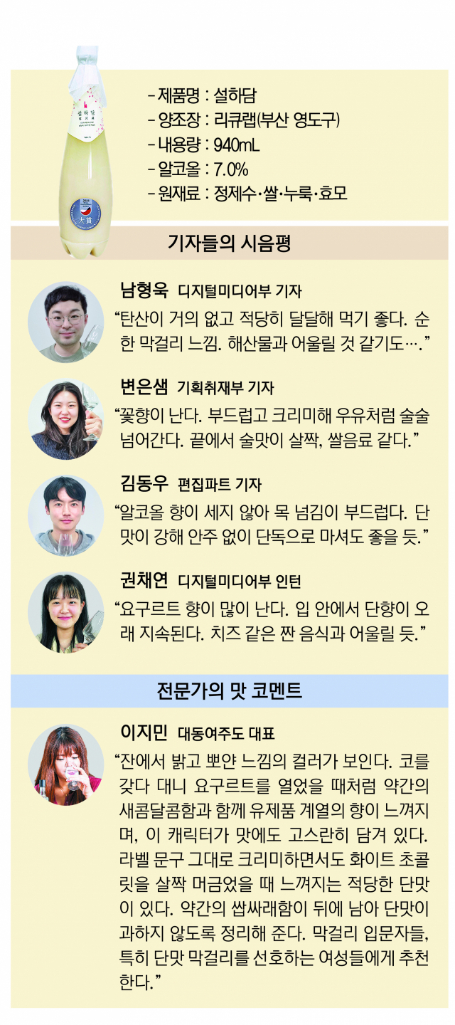 “탄산이 거의 없고 적당히 달달해 먹기 좋다. 순한 막걸리 느낌. 해산물과 어울릴 것 같기도….”