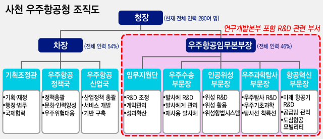 현재 사천 우주항공청에는 280여 명의 인력이 근무 중이다. 이 가운데 연구개발을 담당하는 건 R&D 부서 인력으로 전체의 46% 수준이다. 개정안은 사실상 우주항공청 인력의 반을 떼서 대전시로 보내겠다는 안이나 다름 없다.