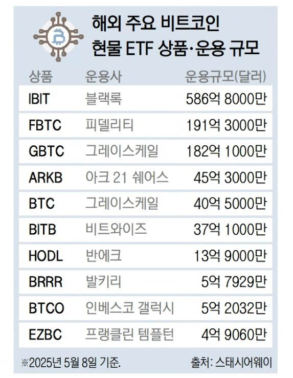 자산관리 플랫폼 스태시어웨이의 지난달 8일 기준 자료를 보면 주요 비트코인 현물 ETF 상품 중 운용 규모 1위는 블랙록의 IBIT(586억 8000만 달러)였다. 이어 피델리티의 FBTC(191억 3000만 달러)와 그레이스케일의 GBTC(182억 1000만 달러) 순으로 운용 규모가 컸다.