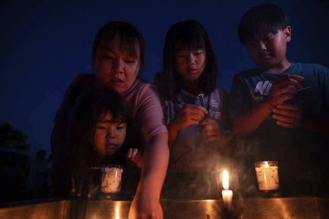 6일 일본 히로시마 평화기념공원을 아이들과 함께 찾은 방문객이 원자폭탄 투하 80주년 ‘전몰자 위령식·평화기원식’을 앞두고 향을 피우며 추모하고 있다. AP연합뉴스