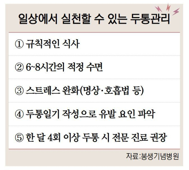 특히 뇌출혈이나 뇌경색, 뇌수막염 등으로 인한 두통이나 갑작스럽고 새로운 양상의 두통이나 일반 진통제에 반응하지 않는 두통, 50세 이후 새로 발생한 두통 등의 경우엔 즉각적인 검사와 진단이 필요하다. 박 과장은 “두통은 참는 병이 아니다”며 “증상이 반복된다면 무조건 참거나 진통제에 의존하는 대신 연령과 증상에 맞춰 전문적인 관리와 맞춤 치료를 받는 것이 우선”이라고 조언했다.