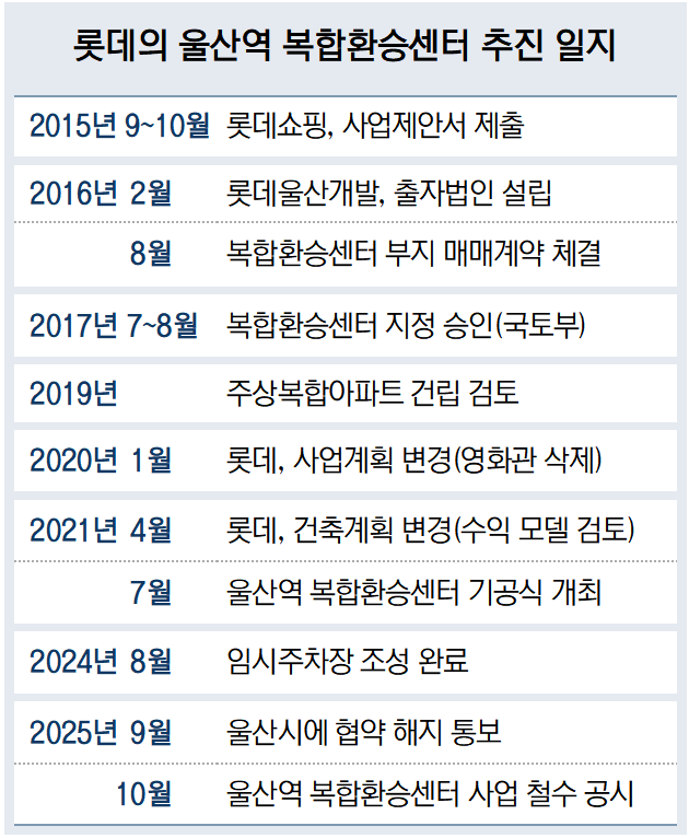 금싸라기 부지를 내주고 복합환승센터를 기다려 온 울산시도 당혹감을 표하며 후속 대책 마련에 착수했다. 울산시 관계자는 “롯데 측에 협약 내용을 면밀히 검토해 사업 지연과 포기에 대한 페널티 부과를 검토하겠다”라고 밝혔다.