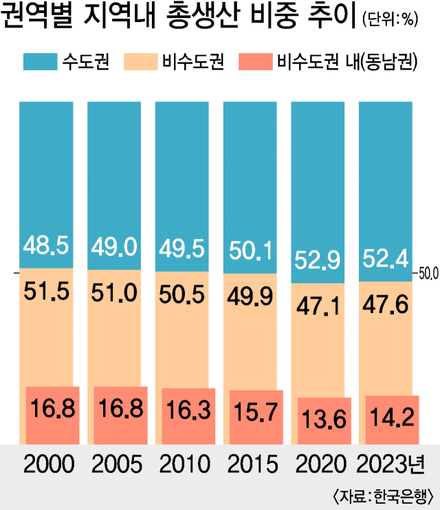 실제 권역별 지역내총생산 비중을 살펴보면 2020년 수도권이 48.5%, 비수도권이 51.5%를 차지하며 비수도권 비중이 높았지만 2015년에는 수도권이 50.1%, 비수도권이 49.9%로 역전됐다. 이어 2023년에는 수도권이 52.4%, 비수도권이 47.6%로 격차가 더 벌어지고 있다. 이 중 동남권이 차지하는 비중도 2000년 16.8% 수준이던 것이 2023년에는 14.2%로 쪼그라들었다.