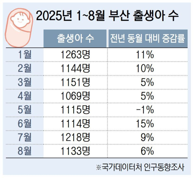 부산은 지난해 합계출산율이 9년 만에 증가세로 돌아섰는데, 올해는 지난해보다 아이가 더 많이 태어나고 있다. 전국적으로도 출생아 수가 늘고 있지만 부산은 지난 6월부터 8월까지 전년 동월 대비 출생아 수 증가율이 전국 평균보다 높았다. 특히 지난 6월에는 전국에서 가장 높은 증가율을 기록했다.