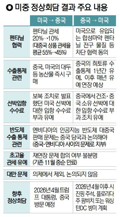 30일 부산에서 열린 미중 정상회담에서 미국은 중국을 상대로 시행 중인 합성마약 펜타닐 관련 징벌적 관세를 기존 20%에서 10%로 낮추고, 중국은 희토류 수출 통제를 1년간 유예하기로 했다. 양국이 무역 전쟁 확전을 자제하기로 결정하면서 일시적으로 긴장은 완화되는 모습이다. 그러나 대만 문제 등 미해결 쟁점이 많이 남아 양국 갈등의 중대 전환점을 만들 유의미한 결과까진 도출하지 못했단 평가다.