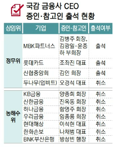 금융권에 대한 국감은 지난달 27일 금융위와 금감원에 대한 종합감사를 끝으로 마무리됐다. 하지만 한 달 가까이 지속된 국감 기간 내내 금융권 CEO의 얼굴은 찾아보기 힘들었다. 정무위 국감 출석자 가운데 민간 금융사 CEO는 단 5명에 불과했다. 홈플러스 사태 논란의 중심에 선 김병주 MBK파트너스 회장과 김광일·윤종하 부회장, 해킹 사태로 홍역을 겪은 조좌진 롯데카드 대표, 김윤석 신협중앙회장 등이다. 당초 증인으로 채택됐던 오경석 두나무(업비트) 대표와 김인 새마을금고중앙회장은 국감 직전 채택이 철회됐다.