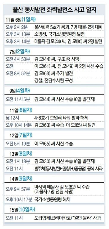 9명의 사상자를 낸 울산 동서발전 화력발전소 붕괴 사고가 8일 만에 매몰자 7명의 시신을 모두 수습하면서 수색 작업이 마무리됐다. 붕괴 사고는 이제 원인 규명과 관련자 책임 소재를 가리는 쪽으로 무게 중심이 옮겨갔다. 정부는 원·하청뿐 아니라 발주처까지 책임 범위를 열어놓고 원인 규명을 약속했다.