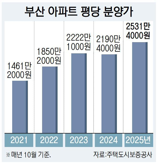 지난해 10월 기준 부산의 평당 분양가는 2190만 4000원으로 1년 새 15.5% 상승했다. 2022년 10월의 경우 평당 분양가가 1850만 2000원에 불과했으니 3년 새 36.8%나 급등한 셈이다.