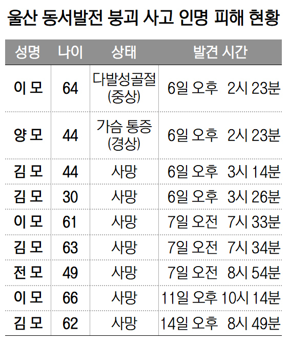 앞서 지난 6일 한국동서발전 울산화력발전소에서는 가로 25m, 세로 15.5m, 높이 63m 규모의 보일러 타워 5호기가 철거 작업 중 붕괴했다. 이 사고로 현장 작업자 9명 중 7명이 숨졌고, 이 씨 등 2명은 중경상을 입고 가까스로 구조돼 치료받고 있다.