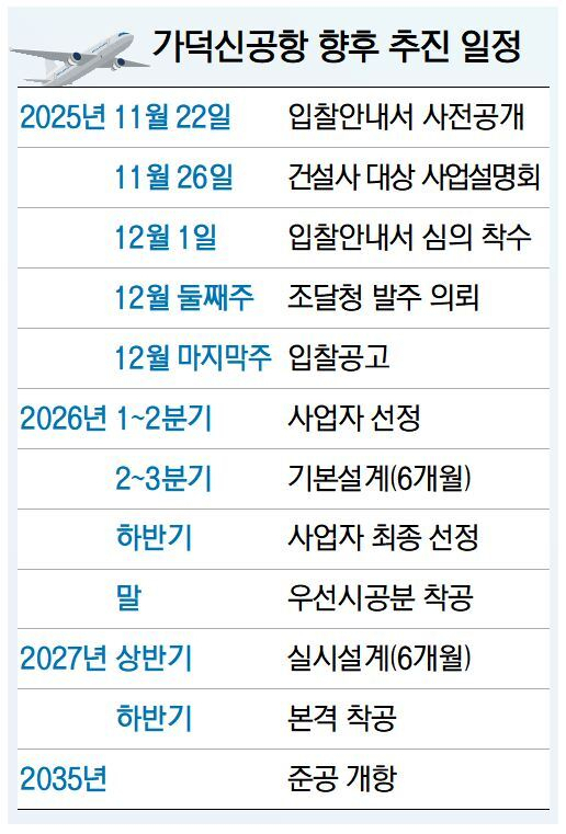 가덕도신공항건설공단은 설명회 후 내부 절차를 거쳐 12월 둘째 주 조달청에 발주해 입찰을 진행할 예정이다. 공단 측은 워낙 큰 대형 공사여서 입찰 과정을 순조롭게 관리하기 위해 자체 발주하지 않고 조달청이 발주한다는 설명이다. 이후 12월 마지막 주 조달청이 입찰공고를 낼 예정이다. 만약 사전적격성 심사를 원하는 건설사가 1개 컨소시엄만 참여한다면 입찰은 유찰되고 재입찰에 들어간다.