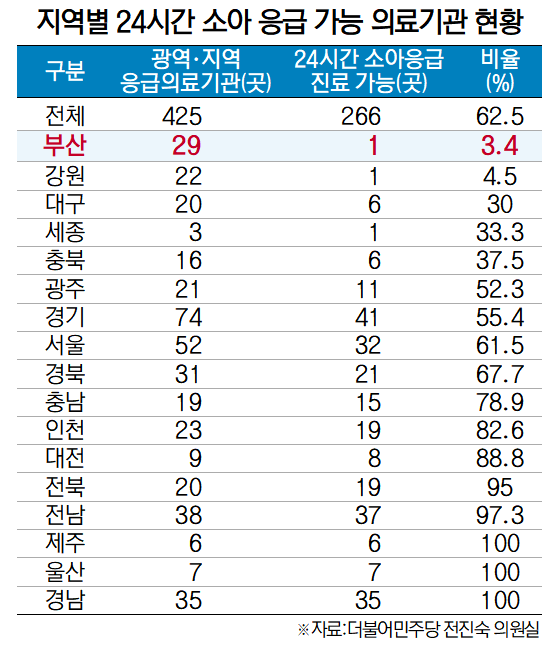 이런 탓에 부산은 전국에서도 소아 응급진료 자원이 가장 부족하고, 대표적인 의료 취약지인 강원보다도 열악한 것으로 추정된다.보건복지부가 더불어민주당 전진숙 의원실에 제출한 자료에 따르면, 부산의 광역·지역 응급의료기관 29곳 중 24시간 소아응급 진료가 가능한 곳은 단 1곳이었다. 이는 전체의 3.4%에 해당한다. 대표적 의료 취약지인 강원은 응급의료기관 22곳 중 1곳(4.5%)만 24시간 소아응급 진료가 가능한 것으로 나타났다. 의료 자원이 비교적 풍부한 부산의 상황을 감안하면 취약성이 더욱 두드러지는 것이다.