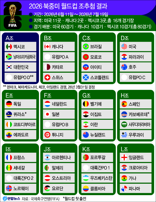 전날 미국 워싱턴DC의 케네디 센터에서 열린 조 추첨식에서 각 조 편성과 대진이 결정됐고, 각 경기의 시간과 장소는 이날 공개됐다.
