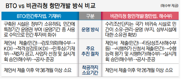 해수부가 부산 신항 수리조선단지 사업을 비관리청 항만개발 방식으로 전환하기로 한 것은 △사업 최초 제안자인 대륙금속 컨소시엄(대륙) 측의 올해 9월 사업방식 변경 추진 의향서 제출 △새 정부 국정과제 반영 △미 트럼프 행정부의 MRO 요청 및 ‘마스가 프로젝트’ 연계 등 대내외 여건 변화 등을 종합적으로 고려한 조치다. 수익형인 BTO(민간투자법, 기재부) 방식은 제안서 제출 후 착공까지 약 36개월 이상이 소요되는 데 비해 비관리청 항만 개발(항만법, 해수부) 방식은 이보다 1년 정도 단축된 약 24개월 이상 소요된다. 비관리청 항만개발 시 수리조선단지는 국가 비귀속 시설로, 민간이 소유·관리·운영한다.