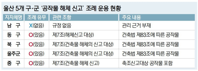 그러나 남구청의 해명과 달리 지자체마다 자체 조례를 제정해 안전망을 구축하고 있다. 울산시 5개 구·군의 ‘건축물 관리 조례’를 보면 남구를 제외한 4곳은 모두 공작물 해체 시 신고를 의무화하는 조항을 두고 있다. 울산 북구(제7조)·동구(제7조)는 물론, 지난해 12월 관련 조항을 정비한 울주군(제7조)도 ‘건축법 제83조에 따른 공작물’을 해체 신고 대상으로 명시하고 있다. 대규모 산업단지가 위치한 전남 여수시와 경남 거제시, 충남 서천군 역시도 모두 조례를 통해 공작물 해체를 관리 중이다.