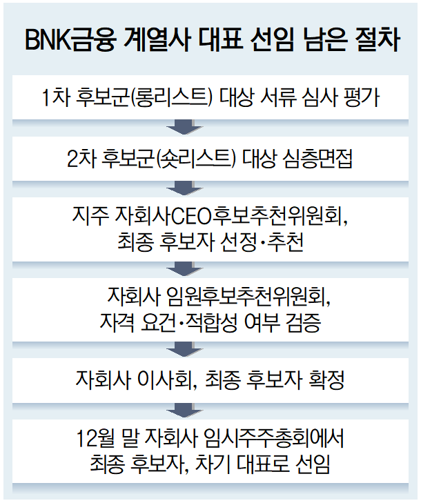 자추위는 지난 10월 15일 자회사 대표 선임을 위한 1차 후보군(롱리스트)를 확정하는 등 BNK금융지주 회장보다 선임 절차에 먼저 돌입해 현재 2차 롱리스트를 압축하는 작업까지 해 둔 것으로 전해졌다.