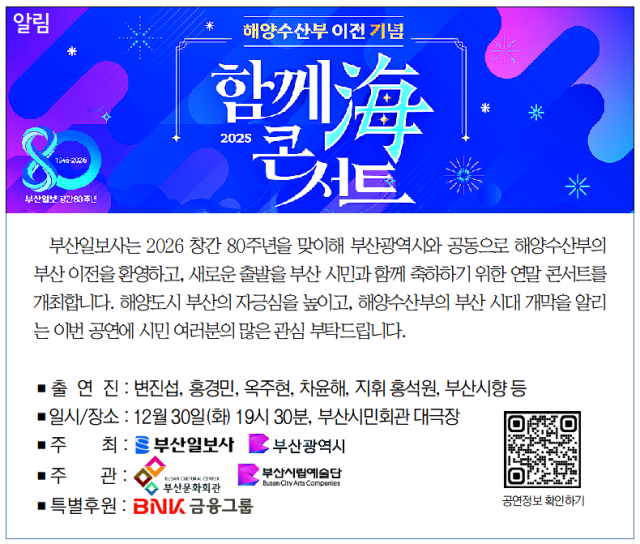 부산일보사는 2026 창간 80주년을 맞이해 부산광역시와 공동으로 해양수산부의 부산 이전을 환영하고, 새로운 출발을 부산 시민과 함께 축하하기 위한 연말 콘서트를 개최합니다. 해양도시 부산의 자긍심을 높이고, 해양수산부의 부산 시대 개막을 알리는 이번 공연에 시민 여러분의 많은 관심 부탁드립니다.