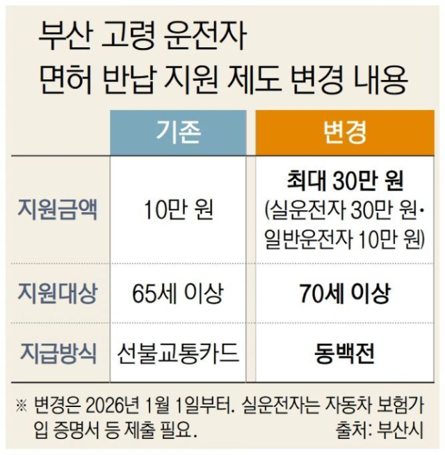 고령 운전자 교통사고를 줄이기 위해 부산시가 운전면허 자진반납 제도를 대폭 손질한다. 실제 운전자임을 증명할 경우 지원금을 기존 10만 원에서 최대 30만 원으로 늘리는 대신, 지원 대상 연령은 65세에서 70세 이상으로 상향한다. 아울러 반납 보상 수단을 교통카드에서 지역화폐로 전환해 제도의 실효성을 높인다는 구상이다.