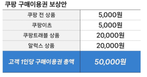 항목별로 쿠팡 전 상품(5000원), 쿠팡이츠(5000원), 쿠팡트래블 상품(2만 원), 알럭스 상품(2만 원) 등 고객당 5만 원 상당의 1회 사용이 가능한 4가지 구매 이용권 형태로 지급한다.