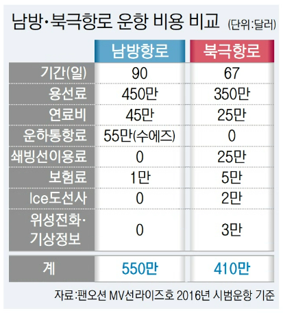 한국은 2013년 현대글로비스를 시작으로 2016년 팬오션과 SLK국보까지 5차례 북극항로를 시범 운항했다. 모두 컨테이너 화물이 아닌 나프타나 중량 복합화물(벌크)이었다. 과거 운항 경험에서 북극항로에 경제성이 얼마나 있는지를 가늠해 볼 수 있는데, 팬오션 이명욱 프로젝트영업팀장은 지난해 국회에서 열린 토론회에서 북극항로 운항이 남방항로보다 140만 달러가량의 비용 절감 효과가 있다고 평가했다.