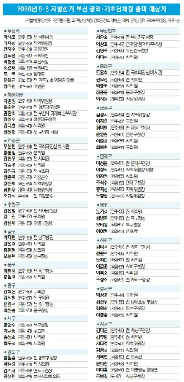 이러한 가운데 부산시장 선거는 민주당 전재수 의원과 국민의힘 박형준 부산시장 맞대결 성사 여부가 관건이다. 민주당에선 레이스에 뛰어든 이재성 사하을지역위원장에 더해 박재호 전 국회의원의 도전 가능성이 제기된다. 국민의힘에선 일찍이 3선 도전을 공식화한 박형준 부산시장에 다선인 김도읍, 조경태 의원의 출마설이 나온다. 이밖에 조국혁신당 조국 당대표, 진보당 윤택근 전 민주노총 위원장 직무대행, 개혁신당 정이한 대변인 등도 후보로 거론된다.