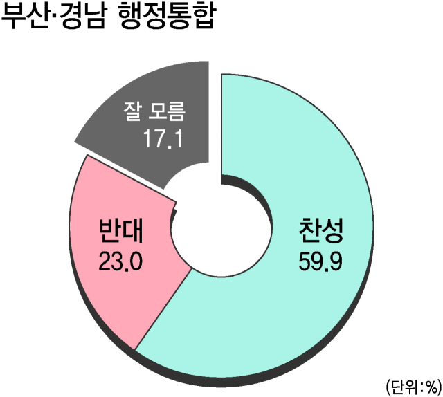 〈부산일보〉가 신년을 맞아 한국사회여론연구소를 통해 지난 2~3일 부산 지역 거주 만 18세 이상 1000명을 대상으로 부산·경남 행정통합에 대해 어떻게 생각하는지 질문한 결과, 찬성 59.9%, 반대 23.0%, 잘 모름 17.1%로 나타났다.