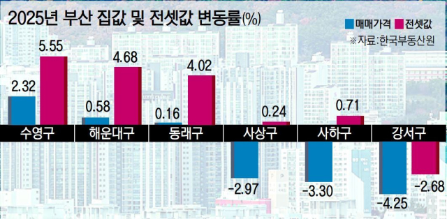 5일 한국부동산원에 따르면 지난해 1~12월 수영구 아파트 매매가격의 누적 변동률은 2.32%를 기록하며 지역 내에서 가장 가파른 상승세를 보였다. 해운대구(0.58%)와 동래구(0.16%)가 작게나마 상승세를 나타냈으며, 나머지 13개 구·군은 모두 전년 대비 하락했다.