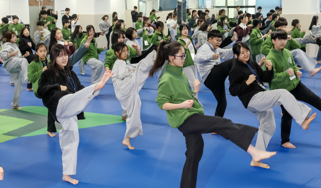 7일 부산 남구 동명대에서 겨울방학 인성 영어·수학캠프가 열려 예비 중학생 80여 명이 ‘태권도로 아침을 깨워요’ 프로그램에 참여하고 있다. 동명대는 지난 5일부터 3주간 방학 중 학습 공백 해소를 위해 몰입형 영어·수학 수업과 인성 함양 프로그램, 대학 특화 프로그램 등을 진행한다.