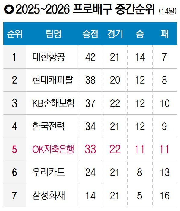 OK저축은행은 13일 인천 계양체육관에서 열린 진에어 2025~2026 V리그 남자부 원정 경기에서 선두 대한항공을 상대로 풀세트 접전 끝에 세트 스코어 3대2로 승리했다. 앞서 9일 2위 현대캐피탈을 3대0으로 완파한 데 이어, 리그 최상위 두 팀을 연파하며 2연승을 달렸다. 시즌 성적은 11승 11패, 승점 33. 4위 한국전력(승점 34)을 1점 차로 추격하며 중위권 재편의 핵으로 떠올랐다.