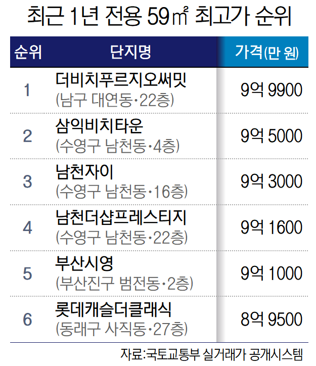 물론 2021년 10월 수영구 삼익비치타운(5층)과 같은 해 4월 해운대구 경남마리나(13층)에서 10억 원을 넘었던 거래가 있기는 하다. 하지만 이는 부동산 활황기 때 재건축 등 투자에 대한 기대감으로 높은 가격이 책정된 것이라 성격이 다소 다르다.
