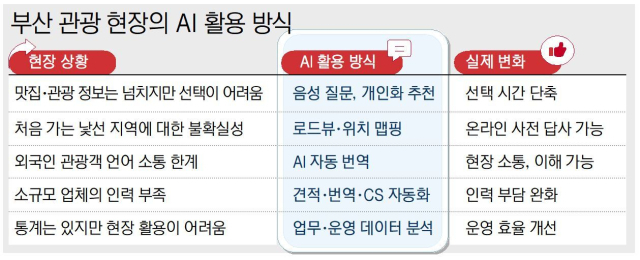 부산 관광 현장에서 AI는 아직 주인공이라고 보기는 어렵다. 다만 관광객의 선택을 줄이고, 언어 장벽을 낮추며, 산업 내부의 비효율을 덜어내는 방식으로 이미 쓰이기 시작했다. 이를 현장과 정책, 인력으로 연결하는 구조 설계가 과제로 남아 있다.
