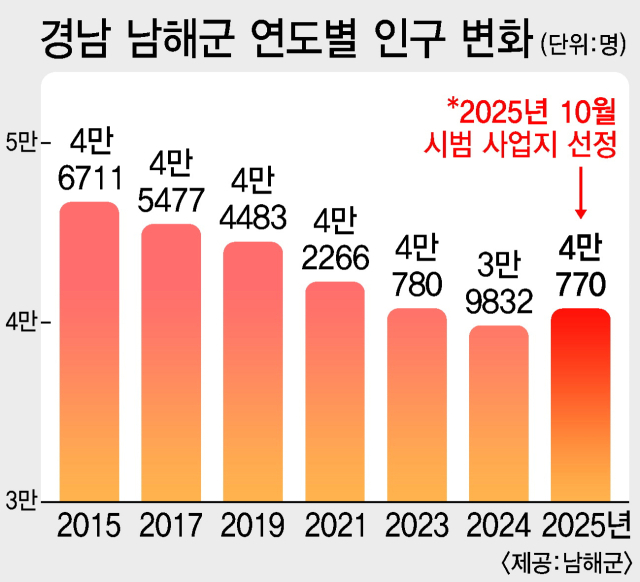 19일 남해군에 따르면 2025년 12월 말 현재 남해군 인구는 4만 770명이다. 2024년에 비해 938명 늘었다. 남해군 연간 인구가 증가한 건 2011년 이후 무려 14년 만이다. 2012년 인구 5만 명, 2024년 4만 명의 저지선이 붕괴하며 한 번의 반등도 없이 줄곧 내리막길을 걸었다. 그런데 지난해 938명이 늘면서 증가세로 돌아선 건 물론 1년 만에 다시 인구 4만 명 선을 회복했다.