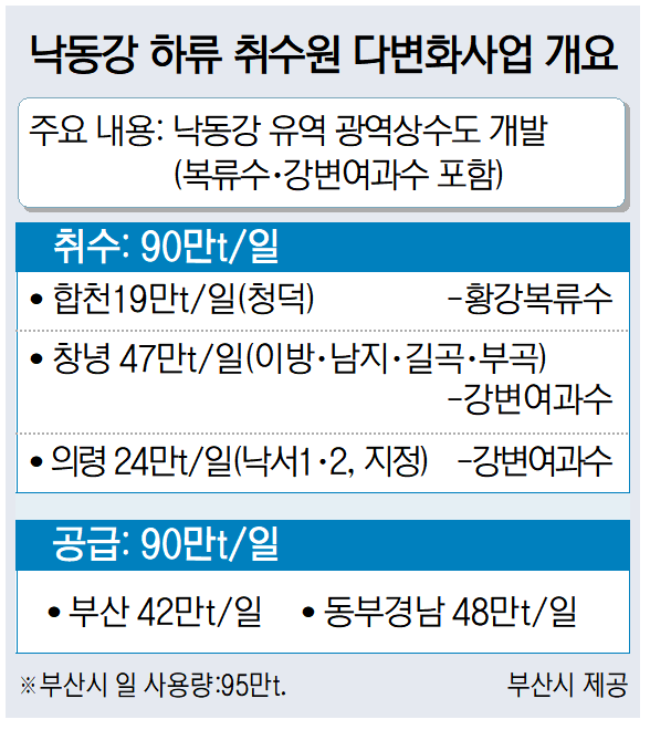 기후부와 부산시에 따르면, 정부는 황강복류수 개발을 통해 경남 합천에서 하루 19만t, 강변여과수 개발을 통해 창녕과 의령에서 각각 하루 47만t, 24만t 등 하루 총 90만t을 공급할 예정이다. 하루 총 90만t의 공급량 가운데 42만t은 부산, 48만t은 동부경남(창원 31만t·김해 10만t·양산 6만t·함안 1만t)에 각각 할당된다.