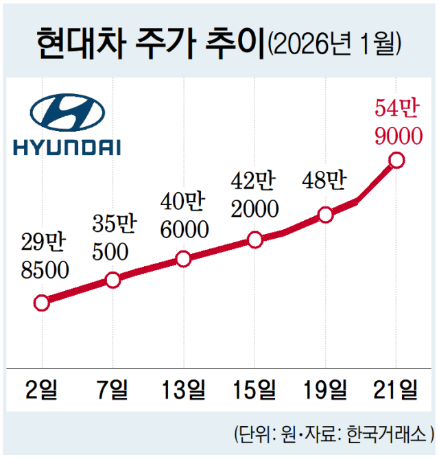 시가총액 상위 종목 중 삼성전자(2.96%)가 3% 가까이 올라 15만 원 목전에서 거래를 마치며 지수를 끌어 올렸다. 현대차14.61%)가 지속되는 로보틱스 모멘텀에 장중 55만 원을 넘어서며 역대 최고가를 경신했으며, 시가총액은 110조 원을 돌파했다. 증권가에서 현대차에 대한 긍정적 전망이 쏟아져 나오면서 투자심리가 한층 더 자극된 것으로 풀이된다. KB증권은“(현대차그룹 로봇 계열사인) 보스턴 다이내믹스가 현대차 생산성 혁신의 결정적 전환점이 될 것”이라며 목표주가 80만 원을 제시했다.