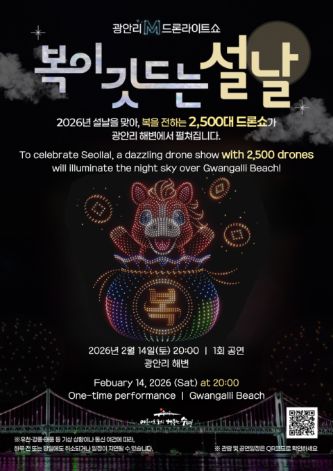 부산 수영구(구청장 강성태)는 설 연휴 첫날인 오는 2월 14일 오후 8시 광안리 해변에서 ‘복이 깃드는 설날’이란 주제로 광안리 M 드론라이트쇼 설 특별공연을 개최한다고 밝혔다.