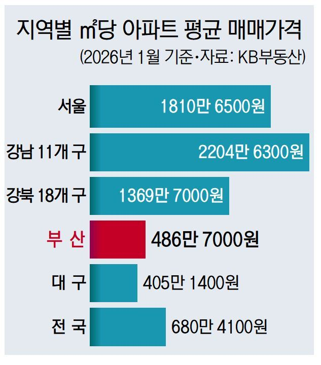 서울의 집값이 천정부지로 치솟는 동안 지방 아파트 가격은 제자리걸음을 하고 있다. 지난해 가을부터 상승장을 맞이한 부산 역시 서울과 비교하면 집값이 올랐다고 하기 민망한 수준에 머물러 있다. KB부동산에 따르면 지난달 부산의 ㎡당 아파트 매매가격은 486만 7000원으로 집계됐다. 이를 34평 수준인 84㎡로 환산하더라도 4억 882만 원 수준에 불과하다. 서울 한강 이남의 중소형 아파트 가격과는 최소 14억 원 이상 차이가 나는 셈이다.