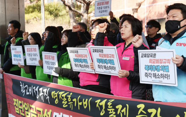 이들은 “명절을 목전에 두고도 학교비정규직 노동자들은 ‘비정규직이라서’ 덜 받는 명절을 강요받고 있다”며 “직무와 무관한 복리후생 수당인 명절휴가비에서조차 정규직과 다른 기준을 적용하는 것은 명백한 차별”이라고 주장했다.