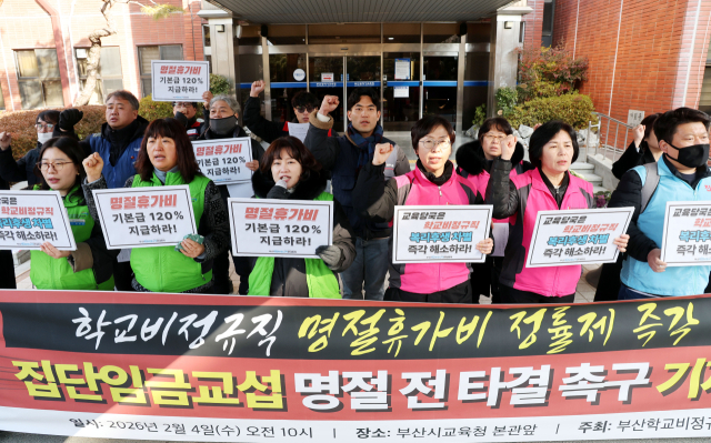 부산학교비정규직연대회의(전국학교비정규직노조 부산지부, 전국교육공무직본부 부산지부)가 4일 오전 부산교육청 본관 앞에서 학교비정규직 명절휴가비 정률제 즉각 시행과 복리후생 차별 해소 등 집단임금교섭 설 명절 전 타결을 촉구하는 기자회견을 진행했다.