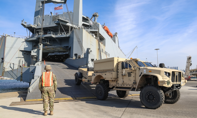 주한미군 제19지원사령부가 4일 부산 남구 부산항 8부두에서 차기 한국 순환배치 예정인 미국 육군 2사단 제2스트라이커여단의 필수장비 반입 모습을 공개하고 있다. 제2스트라이커여단은 9개월 동안 한국에서 작전을 수행할 예정이다.