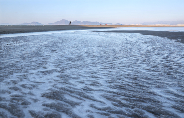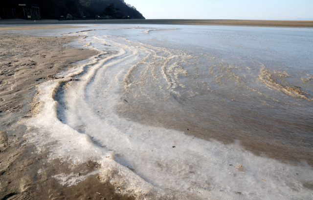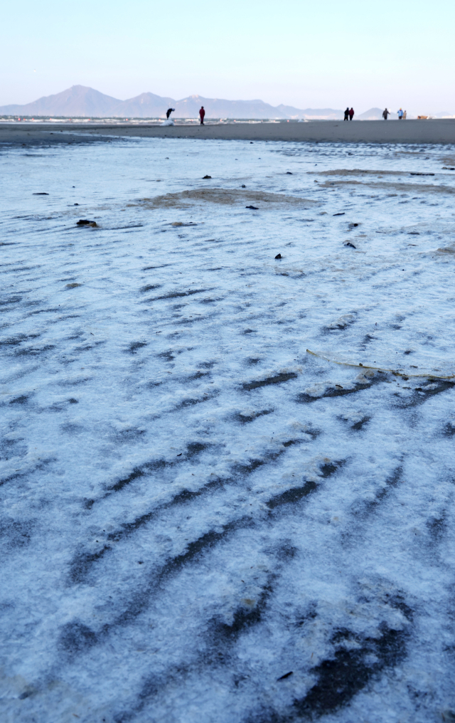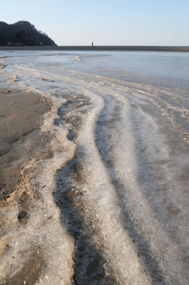 부산의 아침 최저 기온이 영하 8도까지 내려가는 등 전국이 꽁꽁 얼어붙은 8일 오전 부산 사하구 다대포해수욕장에 밀려든 바닷물이 그대로 얼어붙어 강추위를 실감케 하고 있다. 이날 강한 바람마저 불어 체감온도가 영하 10도 아래로 훌쩍 내려가는 매서운 한파가 몰아쳤다.