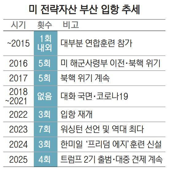 4년간의 침묵을 깨고 2022년 9월과 10월 핵잠수함과 항공모함 등 3차례 전략자산이 부산에 입항했다. 윤석열 정부가 들어서면서 대북·안보 정책이 바뀌었고, 미국도 인도·태평양 억지력 강화를 본격화했다.