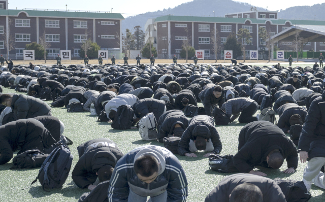 해군병 722기 장정들이 9일 경남 창원시 진해구 해군교육사령부에서 열린 입영식에서 행사에 참석한 부모님을 향해 큰절을 올리고 있다. 해군 제공