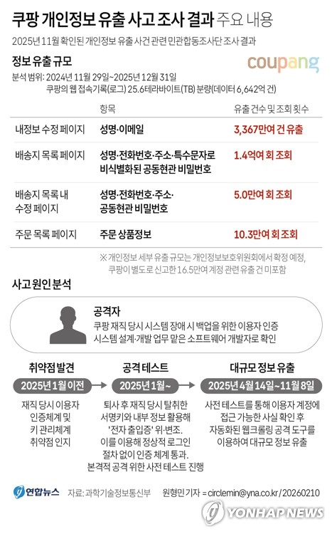 조사단은 “범인이 쿠팡 재직 당시 시스템 장애 시 백업을 위한 이용자 인증 시스템 설계를 맡은 개발자였다”며 “지난해 1월부터 쿠팡 서버의 인증 취약점을 발견하고 공격 여지를 시험한 뒤, 지난해 4월 14일부터 본격적인 무단 유출에 나섰다”고 전했다. 범인은 지난해 11월 8일까지 자동화된 웹 크롤링 공격 도구를 이용해 이용자들의 개인정보를 수집했다. 정보 유출에 다수의 IP가 사용된 것도 확인됐다.