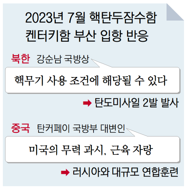 2023년 전략자산 순환 전개 등을 다룬 ‘워싱턴 선언’ 뒤 북한 반발 수위는 더 거세졌다. 그해 7월 전략핵잠수함 켄터키함이 입항하자, 동해상으로 탄도미사일 2발을 발사했다. 비행거리는 550km로, 부산과의 직선거리였다. 강순남 국방상은 “(켄터키함 입항이) 핵무기 사용 조건에 해당할 수 있다”며 핵 선제공격까지 언급했다.