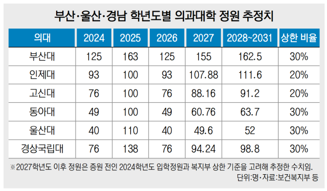대학별 증원 상한 비율을 적용해 보면 부울경 의대에서는 12~37명씩 정원이 늘어날 것으로 보인다. 정원 50명 이상 국립대는 30% 상한, 정원 50명 미만 국립대는 100% 상한을 적용한다. 사립대는 50명 이상이면 20% 상한을, 50명 미만이면 30% 상한을 적용한다.