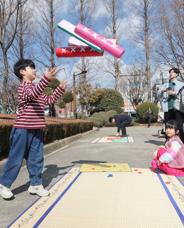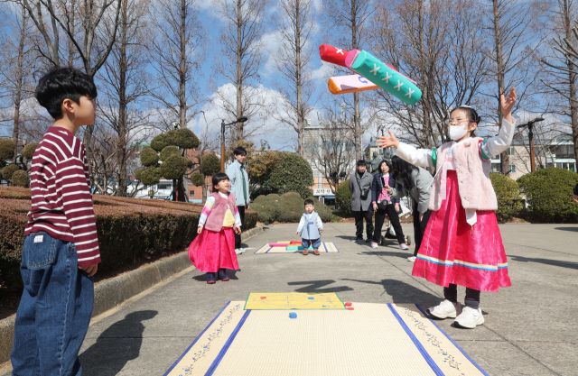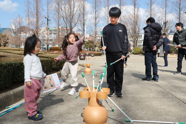 설날인 17일 오후 부산 남구 부산박물관을 찾은 나들이객들이 야외마당에서 윷놀이와 투호놀이, 굴렁쇠 굴리기 등 민속놀이를 하며 여유로운 설 명절을 보내고 있다. 부산박물관은 설 명절 연휴 기간인 14일부터 18일까지 민속놀이 한마당과 새해 연하장 만들기 등 설맞이 행사를 진행했다.