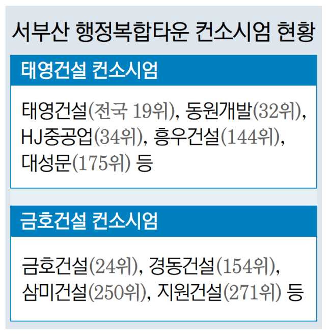 서부산 행정복합타운은 전체 사업비 4133억 원, 공사비 3444억 원으로 올해 입찰 심의 대상인 공공 공사 가운데 지역에서 가장 큰 규모다. 공공 공사 시장이 쪼그라든 탓에 전국적으로도 이목이 집중될 정도로 사업비 규모가 크다. 입찰에는 태영건설 컨소시엄과 금호건설 컨소시엄이 참여했다.